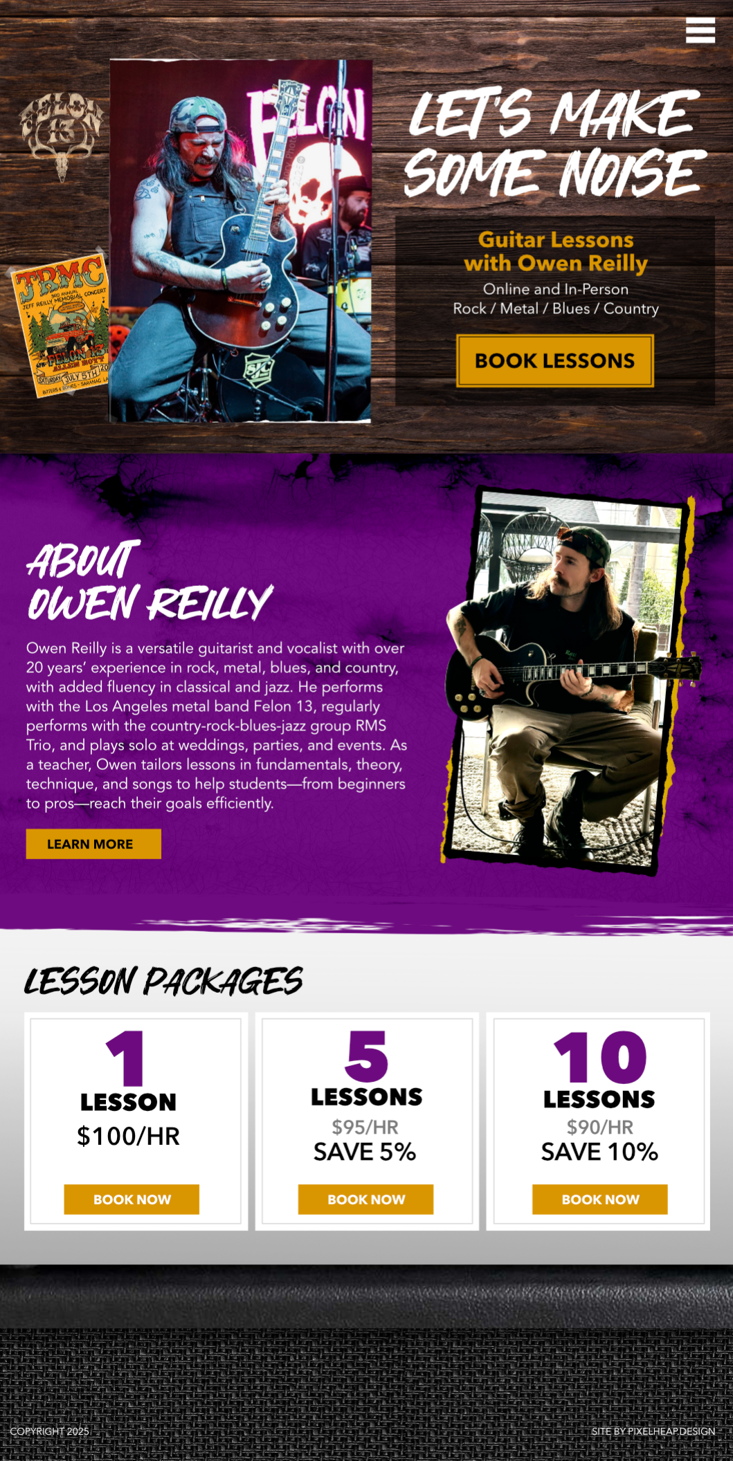 Owen Reilly, a Los Angeles-based guitarist and frontman for the metal band Felon 13, wanted a website that reflected his energy on stage while positioning him as a serious, versatile instructor. The goal was to design a site that rocked visually but still guided visitors clearly toward booking lessons.