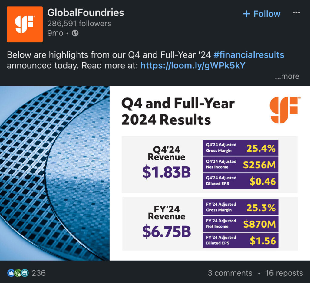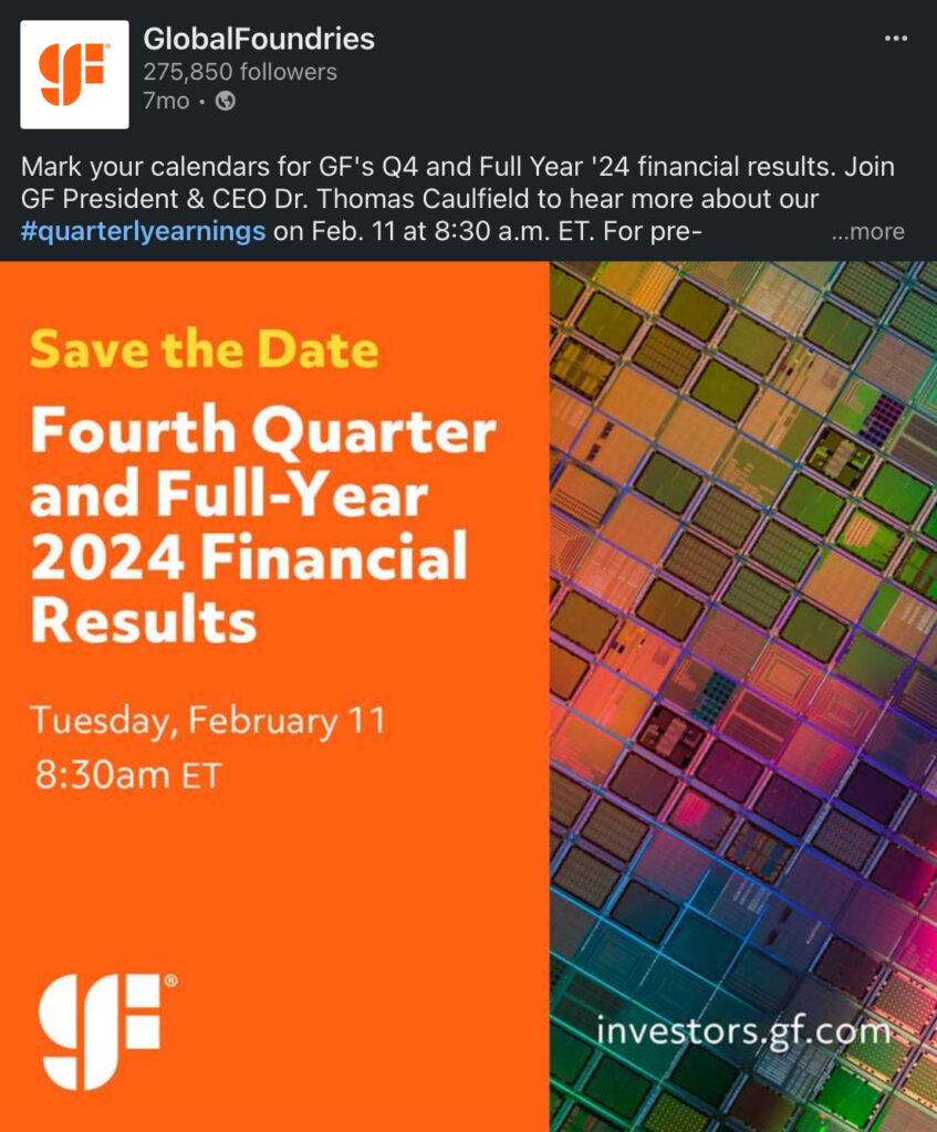 I led the creative direction and execution of GlobalFoundries’ quarterly financial earnings communications across social and digital platforms, developing a coordinated content strategy that built anticipation ahead of each announcement. This included a series of “save the date” teaser posts designed to drive awareness and engagement in the days leading up to the release. On earnings day, I produced and launched the primary social posts and directed audiences to a visually driven infographic that distilled complex financial results and key business highlights into a clear, approachable, and highly shareable format—making the quarter’s performance accessible to both industry analysts and broader audiences.