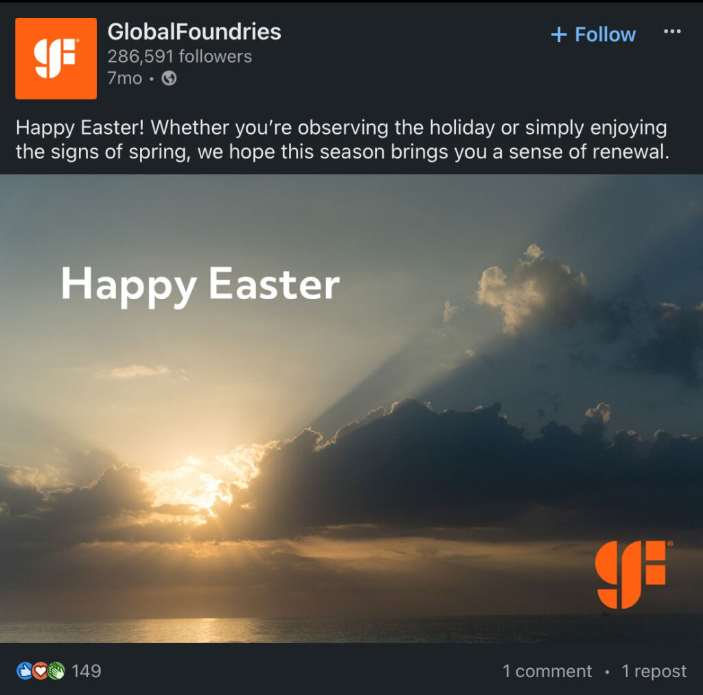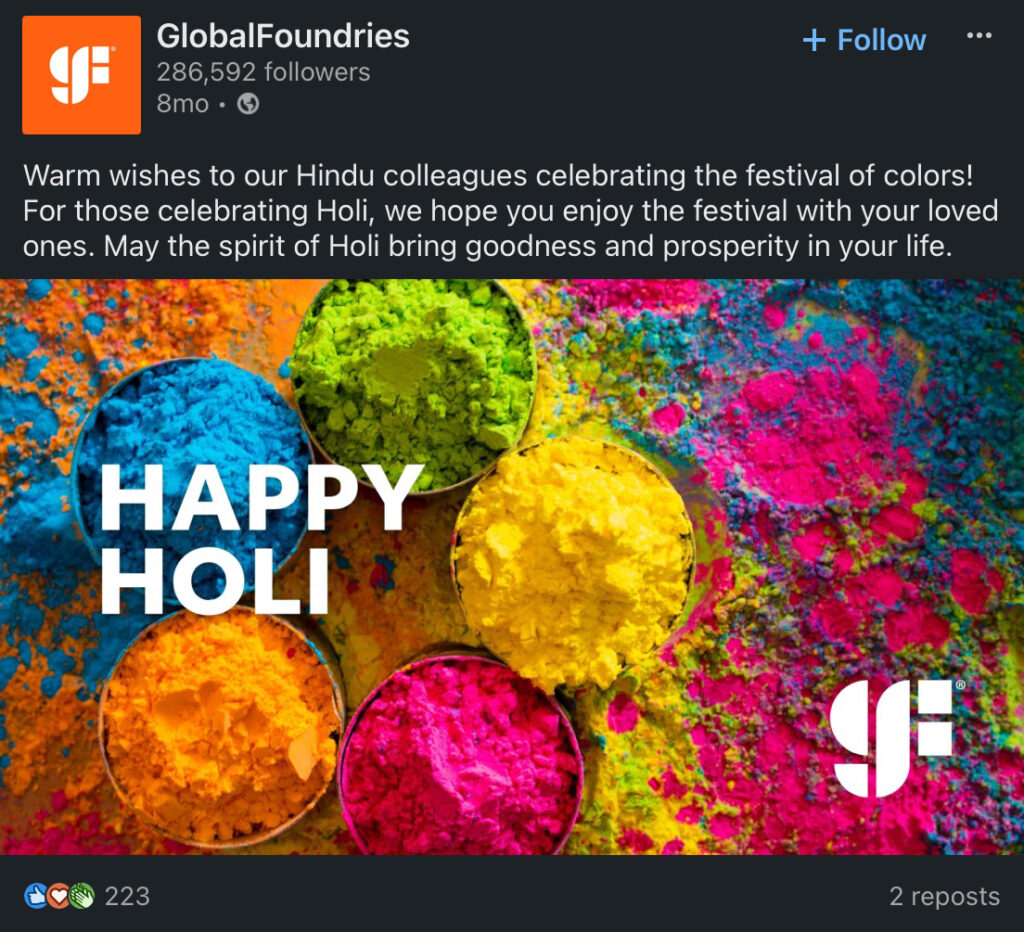 I led the creative strategy for GlobalFoundries’ global holiday and cultural observance communications, developing a thoughtful, inclusive content system that recognized employees, partners, and communities across multiple countries and regions. As an international company with a diverse, worldwide workforce, each post was carefully designed to be culturally respectful, visually cohesive with the brand, and relevant to local audiences—from major global holidays to region-specific observances. These initiatives reinforced a sense of connection across borders while strengthening GlobalFoundries’ brand voice as a truly global organization.