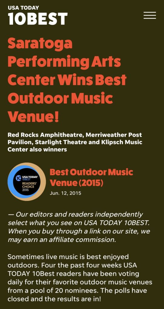 In 2015, I led a targeted social media campaign to rally patrons and local concertgoers to vote for SPAC as USA Today’s Best Outdoor Venue. Through daily posts, venue history features, and behind-the-scenes photography, we activated the SPAC community and outperformed iconic venues including Red Rocks Park Amphitheatre and the Greek Theatre in Los Angeles.